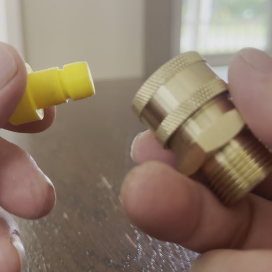 3D printer plugs for 3/8 pressure washer quick connects. Stops leaking out of hose reels during transit.